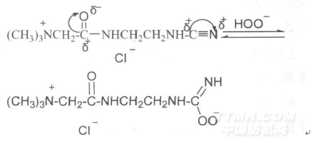 上述甜菜堿衍生物因引入氰氨基,親核試劑過氧化氫陰離子進攻不太穩(wěn)定的三鍵氰基,生成活性很強的亞胺過氧酸陰離子,使該化合物具有更高的活性。反應(yīng)如下: