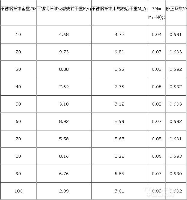 3) 按公式(1)計(jì)算不銹鋼纖維的質(zhì)量修正系數(shù)K;