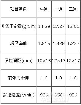 采用“輕定量、低速度、大隔距、重加壓”的工藝原則。采用三道混并以使纖維得以充分混合,混一并采用4根Richcel纖維梳棉條與2根PTT和山羊絨梳棉條一起喂入,混二、混三均采用6根并合;壓力適當加重,增加對纖維的控制,使握持力和牽伸力相適應,確保纖維在牽伸中穩定運動,以提高成紗條干水平;適當降低車速,并嚴格控制車間溫濕度,可減少纖維纏繞羅拉和膠輥現象,保持各機通道光潔,無毛刺掛花。經過采取以上工藝措施,使未并條烏斯特條干CV%值達到2.8%,重量不勻率控制在0.67%。并條工序主要工藝參數見表1: