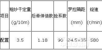 采用“低速度、大捻系數、大后區隔距、小后區牽伸、小鉗口隔距、中加壓”的工藝原則,以提高成紗質量。較大的細紗后區隔距和較小的后區牽伸倍數,配以較大的粗紗捻系數,使粗紗經細紗后區牽伸后,有余捻進入前牽伸區,使纖維間緊密接觸,有利于皮圈對纖維運動的有效控制,因而改善成紗條干,減少毛羽。合理選擇鋼領、鋼絲圈,減少因兩者之間的磨擦而引起更多的毛羽,選用72°膠輥。車間相對濕度控制在65%以上,主要工藝參數見表3: