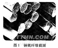 銅氨纖維以棉籽絨為原料,溶解在氫氧化銅或堿性銅鹽的濃氨溶液內,配成紡絲液,經濕紡而制成再生纖維素纖維。它擁有近似圓形的截面(圖1),表面多孔,無皮芯結構,具有優異的染色性、吸濕性和樹脂加工性,以及鮮明的顯色性和真絲般的光澤。結合銅氨纖維的特點及色織襯衫紡織品的要求,將棉與銅氨纖維混紡,開發了棉/銅氨混紡色織面料,該產品光澤亮麗、手感柔軟、懸垂感強。