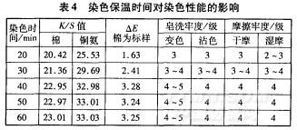由表4可知,隨著染色時間的延長,棉和銅氨纖維K/S值呈上升趨勢,無論深色還是淺色系列,20min時均出現不同程度的色花,染色不均勻,混紡紗線色牢度差。50min和60min與40min時色差值基本一致,染色時間較長,浪費能源。綜合考慮,染色保溫時間選用40min為宜。