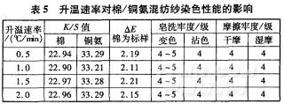 按1.2.I節(jié)二浴前處理工藝對棉、銅氨、棉/銅氨混紡筒子紗進行處理后,改變升溫速率,按1.2.2節(jié)工藝對其進行同浴染色,測定棉和銅氨染色紗線的K/S值、,SE及棉/銅氨混紡筒子紗的色牢度,結果見表5。