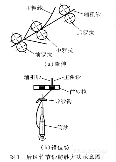 普通竹節紗是通過改變前區牽伸倍數產生竹節的,本文探討的這種新型竹節紗與之不同,它是通過改變后區牽伸倍數產生竹節的,因此,稱之為后區竹節紗。