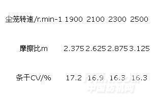 由于過高的塵籠速度會影響紡紗的加捻效率,因此,在摩擦比不變的情況下,提高紡紗速度,成紗捻度會隨之下降,所以紡紗速度應根據塵籠轉速的高低來選擇,不同的紡紗機,其速度范圍不同,