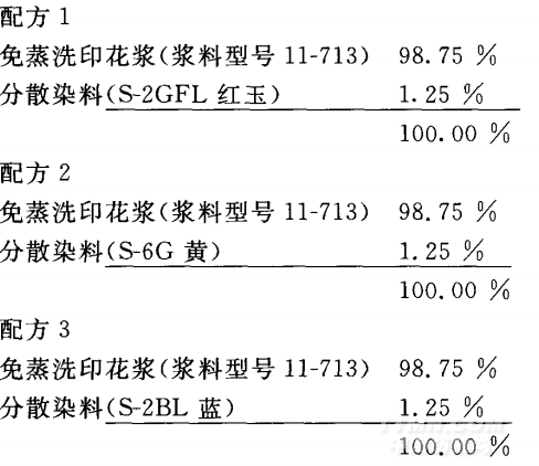 印花漿料:分散染料免蒸免洗印花漿由蘇州大學藝術學院染織實驗室、江蘇省絲綢科學研究所研制,江蘇省絲綢科學研究所經濟技術發展實業中心生產。