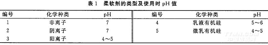 染料:C.I.硫化黃2,C.I.硫化黑1,C.I.可溶性硫化黑2,C.I.可溶性硫化藍l1;柔軟劑(見表1);純棉斜紋織物:經紗 66.67tex,緯紗52.63tex,經緯密度:133×72;非離子表面活性劑SDL(煮練用);氯化鈉、氫氧化鈉、保險粉(染色用);雙氧水;醋酸;標準非離子皂洗液.