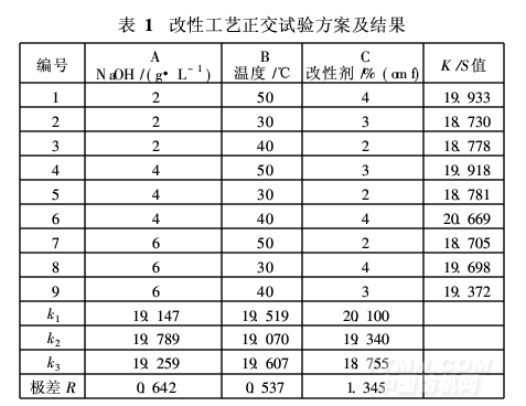在單因素試驗的基礎上,選擇改性劑質量分數、NaOH質量濃度以及改性溫度3個主要因素進行正交試驗,以改性織物的染色K/S值作為評定依據,正交試驗方案及結果見表1。