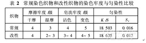 (2)改性織物用4% (omf)活性黑RWN染色,40℃染色,浴比1∶30,染5 min后加入10 g/L純堿,固色60 min。改性后的織物在無(wú)鹽條件下染色,其染色深度達(dá)到常規(guī)染色織物,勻染性較好,但耐濕摩擦色牢度和耐皂洗色牢度下降了0. 5級(jí)。