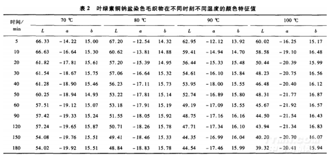 2.2動力學(xué)方程及參數(shù) 為全面研究葉綠素銅鈉鹽在羊毛纖維上的染色 動力學(xué)特征,找到最適合描述此染色過程的動力學(xué) 模型,本文選用2種動力學(xué)模型對葉綠素銅鈉鹽染色毛織物在不同時刻不同溫度的吸光度、上染百分 率及每克織物上的染料量數(shù)據(jù)進行擬合。