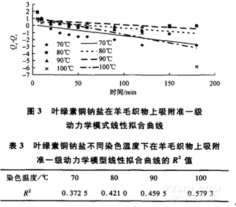 式中:Q 為吸附平衡時纖維上葉綠素銅鈉鹽的含量 (mg/g);Q 為時間 時纖維上葉綠素銅鈉鹽的含 量(mg/g);k 1為一級動力學(xué)反應(yīng)速率常數(shù) (min-1 )。式(5)通過積分后將臨界條件T:0時, Q t=0時和T=t時,Qt =Qe 代入,簡化得到: ln(Qe 一Qt )=lnQe 一k 1T (5) 式(5)中以In(Qe 一Qt )為因變量, 為自變量作圖, 可得到一條直線,并計算出反應(yīng)速率常數(shù)k 。如果 吸附在一種界面上進行,大多數(shù)實驗遵循準(zhǔn)一級動 力學(xué)模式。如果實驗結(jié)果不符合式(5),說明這個 過程不符合一級動力學(xué)方程。用式(5)進行線性擬 合得到葉綠素銅鈉鹽對羊毛織物吸附的準(zhǔn)一級動力 學(xué)模擬曲線,如圖3所示。由圖3可以明顯看出擬 合情況不理想,而表3葉綠素銅鈉鹽不同溫度下在 羊毛織物上吸附準(zhǔn)一級動力學(xué)模式線性擬合曲線的 R 值表明,回歸系數(shù)R 值過小,這些結(jié)果均說明準(zhǔn) 一級動力學(xué)模型不能準(zhǔn)確描述葉綠素銅鈉鹽在染羊 毛纖維上的染色動力學(xué)。