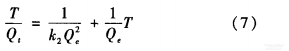 式中:Q。為吸附平衡時纖維上葉綠素銅鈉鹽的含量(mg/g);Q 為時間t時纖維上葉綠素銅鈉鹽的含量 (mg/g);k:為二級動力學(xué)反應(yīng)速率常數(shù) (g/mg·min)。由式(6)通過積分后將臨界條件T: 0,Q =0和T=t時,Q =Q 代入,簡化得到