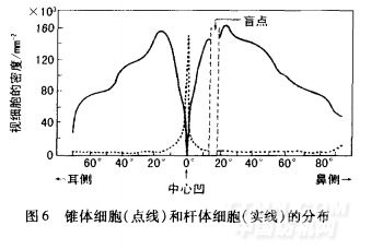 網膜上的視細胞分布如圖6所示 ‘。 ,其中錐體細胞集中在視軸近旁(中央凹)。中央凹是直徑約為1.5 mm的極小區域,這里錐體細胞的分布非常密集,約有10—15萬個,分辨能力最高;與此相反,桿體細胞在視軸近旁數量極少,而廣泛分布在此區以外的部分。由于桿體細胞在暗視覺條件下起作用,所以用斜視眺望夜里的星星時會感到更明亮就是這個道理。