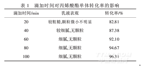 由表2可以看出,從30 min開始轉化率沒有太大改變,但是此時仍有單體刺激味,45 min時單體刺激味消失.綜合考慮轉化率和乳液中無單體氣味,聚合反應保溫時間應控制在45 min較合適.