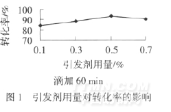 由圖1可以看出,引發劑用量為0.5%(對單體總質量)時,單體轉化率可達90%以上.由于未反應單體通過后續保溫可進一步降低.因此,控制引發劑用量為0.5%。