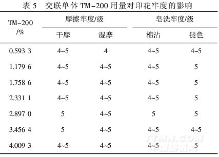 TM-200是含有雙鍵和其他功能性官能團的市售交聯單體,乳液聚合時通過雙鍵聚合于高聚物上.在印花時發現,TM-200用量為0.593 3%和4.009 3%(對單體總質量)時,印花糊在調制和使用過程中易出現破乳、堵網現象,織物印花輪廓不清晰.從表5可知,當交聯單體用量為2.897 0%時,印花織物的摩擦牢度和皂洗牢度都較好,故選擇交聯單體用量2.897%.