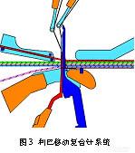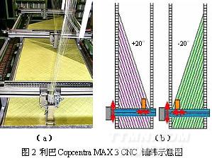 利巴公司的Copcentra MAX 3 CNC型機器的所有功能均為電腦控制;織針機件以外的所有運動均由伺服電機驅動;織物的各種變化,尤其是鋪層角度的調整,均由中央電腦控制。在鋪緯方式方面,兩公司的機器略有不同。利巴機器的鋪緯是由鋪緯滑軌運動、傳輸鏈運動、鋪緯小車運動三者的合成,如圖2所示,只需改變三者的速度就能比較方便地改變鋪緯角度。而卡爾邁耶機器是通過傳輸鏈運動和鋪緯小車運動的合成來形成所需的角度,在角度變換時還需對導軌進行機械操作,比較費時。此外,利巴機器每一紗層的運動完全可以通過程序設計在-20°到+20°之間變化,這與卡爾邁耶的-45°到+45°相比有所改進,機器的標準傳送架可以生產兩個45°襯緯和一個90°襯緯,也可按需要進行長度延伸,延伸后的傳送架最多可襯入7層襯緯紗,1層襯經紗,1層纖維網。同時,利巴機器還采用了其獨特的移動復合針系統(圖3),使得復合針除了在垂直上下運動外,還在水平方向(即織物喂入方向)運動,從而減少了編織過程中織針的負荷;減少了織針與紗線的摩擦;減少了穿刺造成孔洞的可能性,在很大程度上提高了織物的生產效率,改善了織物的質量。據報道,利巴公司已成功推出了用于碳纖維生產的Copcentra MAX 5 CNC Carbon機型。由于碳纖維在織造過程中易產生具有導電性的碳粉,會導致機器及生產環境中的帶電設備爆炸等危險情況發生,因此該類多軸向經編機帶有特殊的密封裝置,其造價達到2800多萬人民幣,是普通多軸向經編機的三倍。在生產過程中,碳纖維增強紗線的鋪緯角度可以在-45°、90°、+45°、0°等角度之間變化,鋪緯層數和原料規格也可以自由選擇,織物品種較豐富。