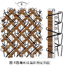 多軸向經編(Multi-axial Warp-Knitted,簡稱為MWK)織物是可以在0o、90o和θ方向(θ在-20º~+20º之間變化)襯入襯經、襯緯和軸向增強紗線,最多可達8層(7層緯紗,1層經紗),再加纖網[5],然后通過經編組織(編鏈、經平、編鏈+經平)將多層紗線綁縛在一起而形成的一種多層織物。圖4為一種典型的四軸向經編織物結構圖,從圖中可以看出,四組襯紗的襯入次序和方向依次為:90°/0°/-30°/+30°,綁縛組織采用經平組織。