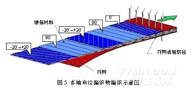在多軸向經編織物的形成過程中,用于編織的紗線在成圈機構的作用下,穿過整個織物,在厚度方向將所有預先鋪設好的承載紗精確地束縛在一起,如圖5所示??椢锟v向、橫向、斜向的穩定性和強度可分別由襯經紗、襯緯紗和在-20°到+20°之間可變角度的軸向紗提供。