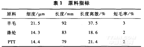 采用21.μ5 m澳毛,14.3μm滌綸短纖,14.4 μmPTT纖維,原料規(guī)格見表1。