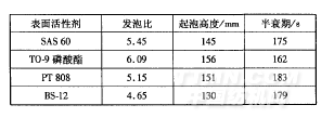 表1各表面活性劑的發(fā)泡指標(biāo)對比