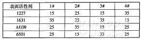 由于柔軟劑都是陽(yáng)離子或弱陽(yáng)離子型產(chǎn)品,所以起泡劑不宜選擇陰離子型表面活性劑。各取質(zhì)量濃度為10g/L陽(yáng)離子型表面活性劑1631、1227和非離子表面活性劑AEO9和6501,其發(fā)泡各項(xiàng)指標(biāo)見(jiàn)表7,柔軟起泡劑的配方見(jiàn)表8,不同配方起泡劑的發(fā)泡性能見(jiàn)表9。