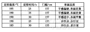 滌綸在紡絲成形過程中經過拉伸,在纖維中存在殘余應力,如果坯布直接進行精練,就會產生收縮和布面折皺,在后續的加工中難以去除。因此,坯布必須在一定張力下先進行預定形,以利于布面平整和尺寸穩定。經試驗,確定預定形溫度為190℃,定形時間為30s。定形溫度過高或時間過長,會使織物手感偏硬;反之,則織物易變形且彈性不足,易產生折皺,達不到定形的目的(表1)。