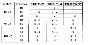 對深藍色印花毛巾采用0.20g/L皂洗酶,測定不同皂洗溫度和時間下的白地沾色牢度、水洗牢度和濕摩擦牢度,見表2。