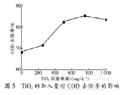 另外,由圖5可知,當(dāng)TiO2投加質(zhì)量濃度達(dá)到750mg/L時,染料廢水COD去除率達(dá)到最大,為85%,而當(dāng)TiO2投加質(zhì)量濃度>750mg/L時,COD的去除率基本恒定在85%左右,甚至有下降的趨勢。這是因?yàn)楫?dāng)TiO2加入量較少時,隨著其濃度的增加,在超聲波作用下,TiO2對超聲的輔助作用逐漸增加,所以COD去除率有上升的趨勢。但當(dāng)TiO2加入量超過一定值時,一方面由于超聲功率一定,在一定時間內(nèi)能夠激發(fā)TiO2使其產(chǎn)生空穴的絕對數(shù)量也一定,因此在宏觀上的表現(xiàn)就是隨著TiO2投加量持續(xù)增加,COD去除率保持恒定。另一方面,由于過多的TiO2晶體之間存在相互屏蔽超聲波的作用,這會導(dǎo)致超聲波利用效率的降低,因此從宏觀上表現(xiàn)為COD去除率的略有下降趨勢。