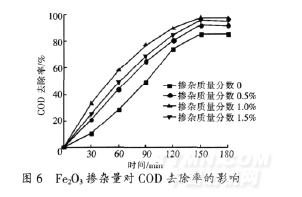 由圖6可知,與純的TiO2相比,F(xiàn)e2O3的加入顯著提高了TiO2的催化功能,COD的去除率最高達到92%,但Fe2O3摻雜TiO2的催化活性并非一直隨著摻雜量的增加而提高,F(xiàn)e2O3摻雜質(zhì)量分數(shù)為1.0%時達到最大催化效果。這可能是因為摻雜一定量的異質(zhì)Fe2O3可以適當?shù)馗淖僒iO2的晶型,有利于提高TiO2的催化功能,摻雜量太多則過分改變TiO2的晶型反而降低了TiO2的催化能力。