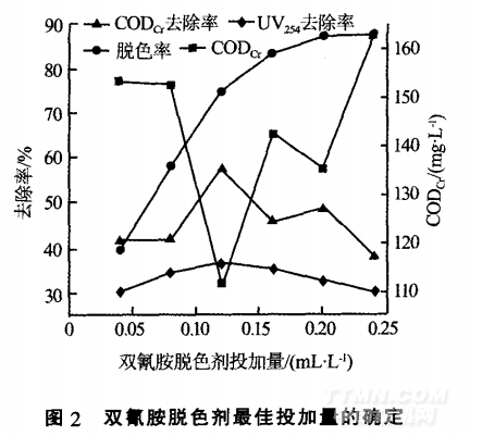 (2)先投加雙 氰胺脫色劑.以200 r/min攪拌30 s,再加人PAC攪 拌30 s;