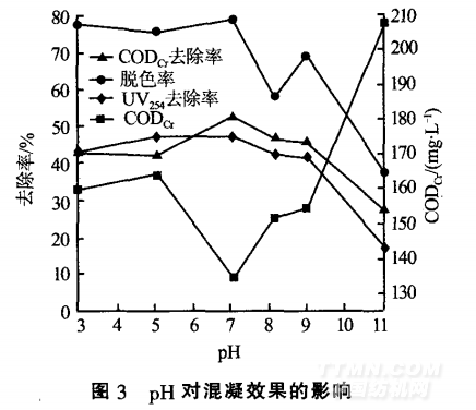 由試驗結(jié)果可知,方式1、方式3 對CODcr 的去除效果最好(去除率分別為54.64%、59.99%).方式2最差(去除率為46.72%),據(jù)此后續(xù) 試驗采用PAC與雙氰胺脫色劑同步投加方式。2.3 DH對混凝效果的影響 用質(zhì)量分?jǐn)?shù)均為10%的稀鹽酸和氫氧化鈉溶 液調(diào)節(jié)水樣DH,按最佳復(fù)合配比和最佳投加方式進 行混凝試驗。結(jié)果見圖3。由圖3可見,該復(fù)合混凝 劑對DH的適應(yīng)性較強。pH=3~9時去除污染物效果比較明顯,CODcr去除率為42%~53%,脫色率為68%~78%.UV2s4去除率為41%一47%(pH在3~7時 基本維持穩(wěn)定且略有上升趨勢,pH在7 9時處理效 果略有下降),pH>9后明顯下降。原因在于堿度太高 使得鋁鹽更多轉(zhuǎn)化為A1(0H),膠體、[A1(0H) ]一、[A1(OH) ]:一等,這些水解產(chǎn)物帶負(fù)電或不帶電荷, 不能與負(fù)電性的染料膠粒表面發(fā)生電中和作用.且 吸附架橋作用減弱,混凝效果不好 ;此外pH增大, 復(fù)合混凝劑的荷正電率會降低[8].不利于與染料形 成締合物(93。綜上所述,pH為7時混凝效果最佳。弱 酸性效果好于弱堿性。
