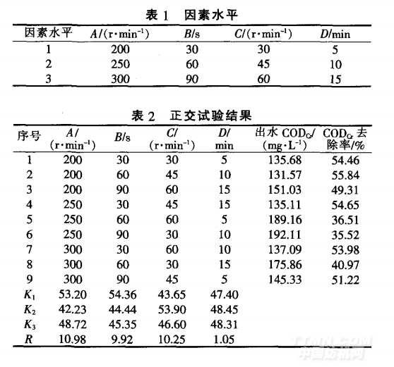 根據表2可知:各因素對混凝效果的影響順序 為A>C>B>D。水平優選組合為AlB1C2D2,相應的G 值為27.05 S-1。GT值為1.62xl(i4。 整體來看.在當前試驗條件下攪拌方式對CODn的去除效果影響不大。為節省動力費用,最佳攪拌方式選擇快速攪拌速度200 r/min,攪拌30 S,慢 速攪拌速度45 r/rain,攪拌10 min。