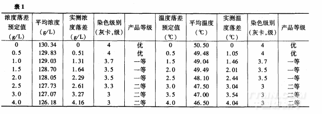 從表1看,紡絲酸浴濃度落差達2.0g/L 以上、溫度落差在2.0℃以上時,絲條染色就 出現了差異,如果再有其它因素影響就會出現 染色降等。因此酸浴指標要嚴格控制,同時對 紡絲機臺錠位間的差異也要定期監控,對發現 的系統酸浴波動和錠位落差大的要進行絲餅隔離降等。