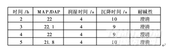 由表5可知,隨著水解時間的延長,產品中單酯的比例增加。從MAP/DAP比例可知,水解3h時,單、雙酯比值達到最高,水解已達到平衡,此時測試標準帆布的沉降時間已達到最短時間,若再延長水解時間已無意義,故確定水解時間為3h。