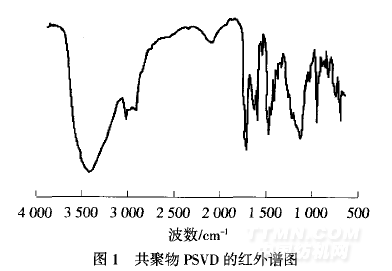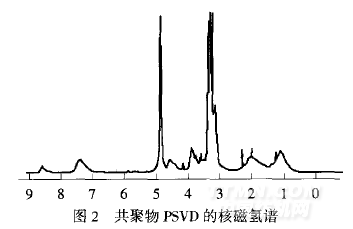 圖1為共聚物PSVD的紅外光譜圖,3425em為季銨鹽基團(tuán)吸水引起的OH伸縮振動峰;1725em為DMC酯鍵羰基(C—O)特征吸收峰;1634on~、1478em~、1452em為苯環(huán)與吡啶環(huán)中c—C伸縮振動峰;1556cm~、1601cm為吡啶環(huán)上C—N伸縮振動吸收峰;l419cm為吡啶環(huán)上C—N對稱伸縮振動吸收峰;1136em為c—O振動吸收峰;755em~、697em為苯環(huán)單取代吸收峰.