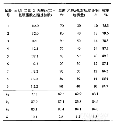 由表1可看出,各因素對產品收率的影響程度次為:n(1,3一二氯一2一丙醇):n(二甲基硬脂酸乙酯基胺)>反應溫度>反應時間>乙醇用量.較佳的工藝條為:(1,3一二氯一2一丙醇):凡(二甲基硬脂酸乙酯基叔胺=1:2.1,80℃反應12h,(乙醇)=40%(對反應物質量).