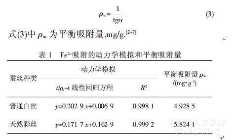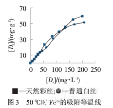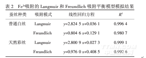 從表2普通白絲和天然彩絲擬合之后的2種吸附模型可見,Langmuir吸附平衡模型模擬結果的相關系數高于Freundlich模擬,Fe2+與蠶絲纖維發生絡合并穩定存在.普通白絲和天然彩絲對Fe2+的吸附屬于Langmuir型吸附.