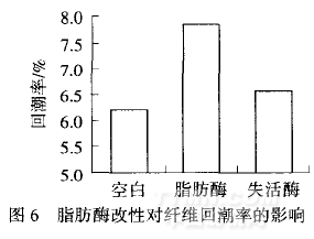 由圖6可以看出,脂肪酶處理后醋酯纖維的回潮率明顯增加,原因是酯基的水解使纖維表面的親水性羥基數量增加.而失活酶處理后纖維回潮率也稍有增加,原因是一定量的酶蛋白吸附在纖維表面.