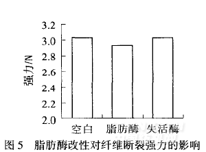 由圖5可知,脂肪酶處理樣、失活酶處理樣與空白樣相比強力均有下降,其中脂肪酶處理樣的強力較空白樣下降8%,而失活酶處理樣的強力只發生微小改變.原因是酶對纖維的催化水解作用在一定程度上破壞了纖維的結構,但纖維發生水解的酯鍵位于分子側鏈,大分子主鏈結構基本不發生變化,且水解僅發生在纖維表面,因此,酶處理后纖維強力變化較小.