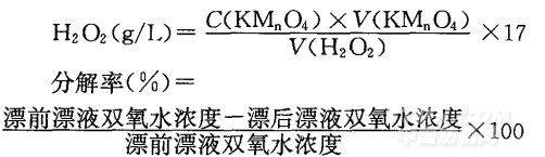 配制0.1 mol/L的高錳酸鉀標準溶液和6 mol/L的硫酸溶液,取5 mL過氧化氫漂液置于100 mL錐形瓶中,加人10 mlL6 mol/L硫酸溶液,然后用0.1 mol/L 的高錳酸鉀標準溶液進行滴定,當溶液自無色變成微紅色且半分鐘不消失即為終點,記下消耗的高錳酸鉀體