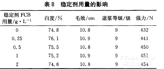 (3)通過實(shí)驗(yàn)得出較為合適的微波前處理工藝:燒 堿15 g/L、過氧化氫10 g/L、穩(wěn)定劑FCB 0.25 g/L、 MRN 5 g/L ,微波中低火加熱5 min。