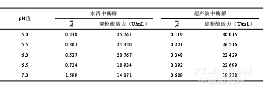 分別配制pH值為5.0,5.5,6.0,6.5,7.0的磷酸氫二鈉-檸檬酸緩沖溶液,只改變緩沖體系,其余按(3.2)試驗(yàn),比較在不同pH值條件下超聲波預(yù)處理對(duì)淀粉酶活力測(cè)定結(jié)果的影響,測(cè)定結(jié)果記錄如表4。