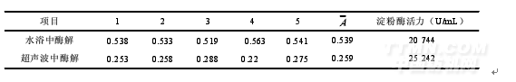 分別取10個(gè)燒杯,按(2.1)加入可溶性淀粉溶液、緩沖液和稀釋淀粉酶液1mL,計(jì)時(shí)搖勻,將其中5個(gè)燒杯放入50℃水浴鍋中酶解5min,另外5個(gè)燒杯放入50℃的超聲波中酶解5min,然后繼續(xù)按(2.1)操作步驟,分別測(cè)定吸光度值。測(cè)定結(jié)果記錄如表3。