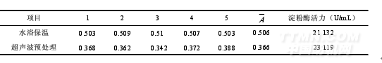 分別取稀釋酶液10mL放入50℃的水浴鍋中與50℃的超聲波水浴中,預(yù)處理15min后取出。按(2.1)測(cè)定兩種方法預(yù)處理后淀粉酶的活力,每種方法分別測(cè)定5次,其結(jié)果記錄如表2。
