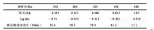 同理,Lg(A)和測(cè)試酶液濃度成線性關(guān)系,經(jīng)作圖可得線性方程:Lg(A)=1.1996-0.02123C。