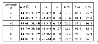 改變改性溫度,研究改性溫度對染色性能的影響,結果見表2。