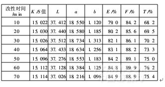 由表2可知,上染率、固色率、總固色率都隨改性溫度升高而增加,當改性溫度為80℃時,上染率達到93.4%,固色率達到93.0%,總固色率達到86.9%,之后基本維持不變。這是因為溫度上升可以促進改性劑與棉纖維間的結合。L、a、b值基本保持不變,說明改性溫度對棉織物染色色光影響不大。所以改性溫度以80℃為宜。