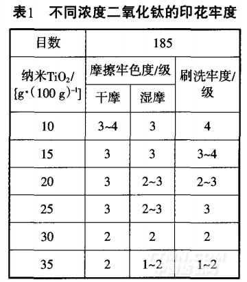 表1是不同濃度二氧化鈦對印花牢度的影響。從表1看出,實(shí)驗(yàn)中選 擇了6個不同的濃度,用185目網(wǎng)進(jìn)行 印花后分別測試了干摩擦、濕摩擦和 刷洗牢度。比較各濃度的印花后牢 度,得出納米二氧化鈦濃度在10~25g/(100 g)時的各項(xiàng)牢度較好;而濃度超過25g/(100g)時,各項(xiàng)牢度開始下降。這可能是由于納米材料濃度升高,在織物表面產(chǎn)生聚集現(xiàn)象引起的,所以從實(shí)驗(yàn)的結(jié)果看,應(yīng)把二氧化鈦濃度選在10~25g/(100 g).