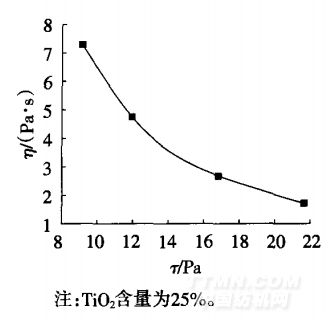 2.1添加了二氧化鈦原糊的流變性 用NDJ一1型黏度計(jì),選取合適的轉(zhuǎn)子,分別以6 r/min、12 r/min、30 r/min、60 r/min等4檔不同轉(zhuǎn)速下測黏度;以對應(yīng)上述4檔轉(zhuǎn)速下的速度 】.256 S-1、2.512 s-1、6I28 s-1、12.58 s-1,按照下式計(jì)算相對應(yīng)的剪切應(yīng)力, 并作圖1。